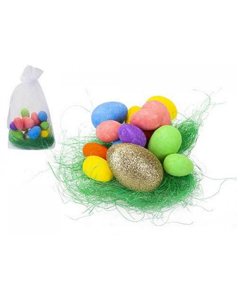 Pack contains 16 assorted sized poly foam eggs with fake grass