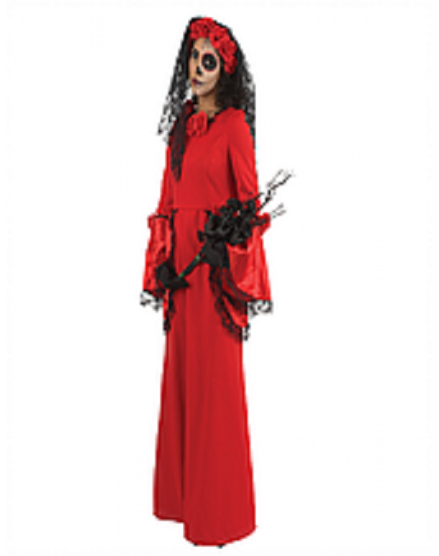 Mexican Day Of The Dead woman's costume consists of a red and black dress , matching headpiece with veil and short black gloves