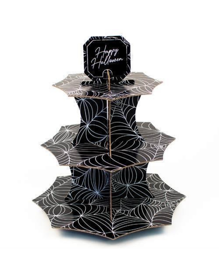 Each cupcake stand is made from a durable card and has 3 assorted sized tiers and can be added to our other spider web Halloween themed tableware